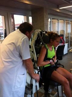 La séance a débuté par une dizaine de minutes d’échauffement. Ensuite, chaque rameuse a été installée sur l’ergomètre isocinétique (voir photo). Le profil anthropométrique de chaque sportive a été considéré afin d’individualiser son installation. Les rameuses étaient assises, le tronc était appuyé sur un dossier et maintenu par des sangles au niveau du tronc, de la taille et des cuisses. Après quelques essais pour s’habituer à l’appareil, les rameuses ont réalisé trois exercices distincts de flexion et d’extension du tronc contre une résistance imposée par la machine à différentes vitesses angulaires (30, 90 et 120 deg.s-1).