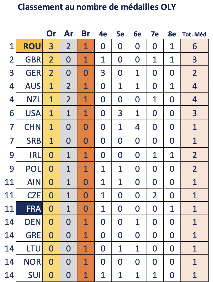 La Roumanie s’est imposée comme la nation dominante de cette étape, avec 6 médailles (dont 3 en or) remportées par ses 10 équipages engagés.