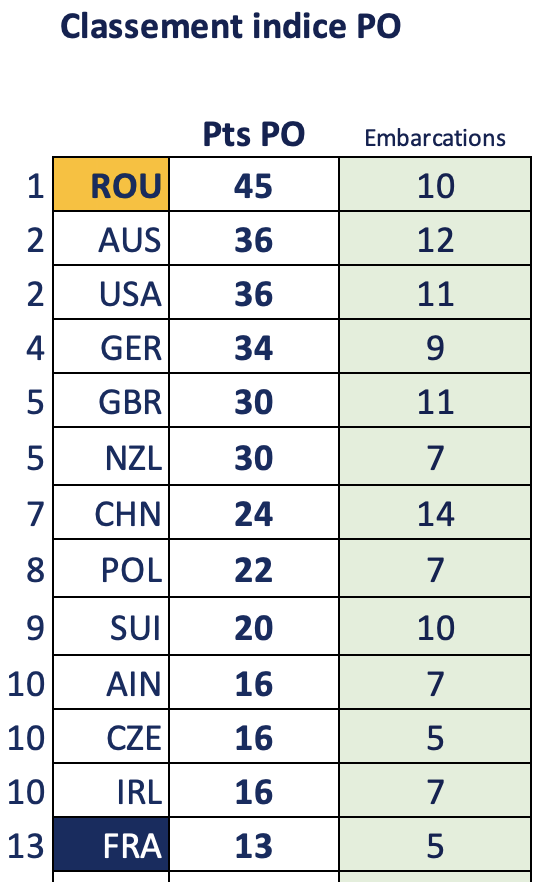 Au classement par points des disciplines olympiques (PO), la Roumanie occupe logiquement la 1ère place, devant l’Australie et les États-Unis, qui avaient respectivement 2 et 1 embarcations de plus. Les équipages de M8+ (5e) et W8+ (2e) de ces deux nations étaient presque tous engagés dans d’autres épreuves.