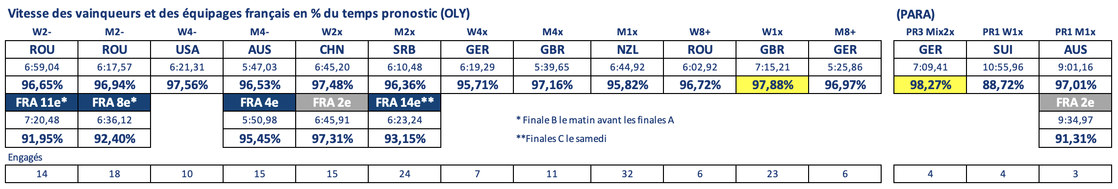L’Équipe de France, engagée avec six embarcations, a décroché deux médailles d’argent (PR1 M1x et W2x). Ces résultats la positionnent au 13e rang du classement des disciplines olympiques (PO) et au 11e rang au tableau des médailles.