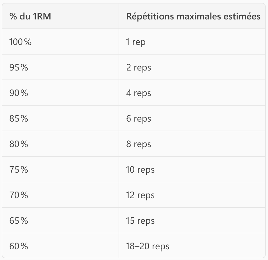 Ce tableau est une estimation : le nombre réel de répétitions peut varier selon le niveau d’entraînement, le type d’exercice et la fatigue.