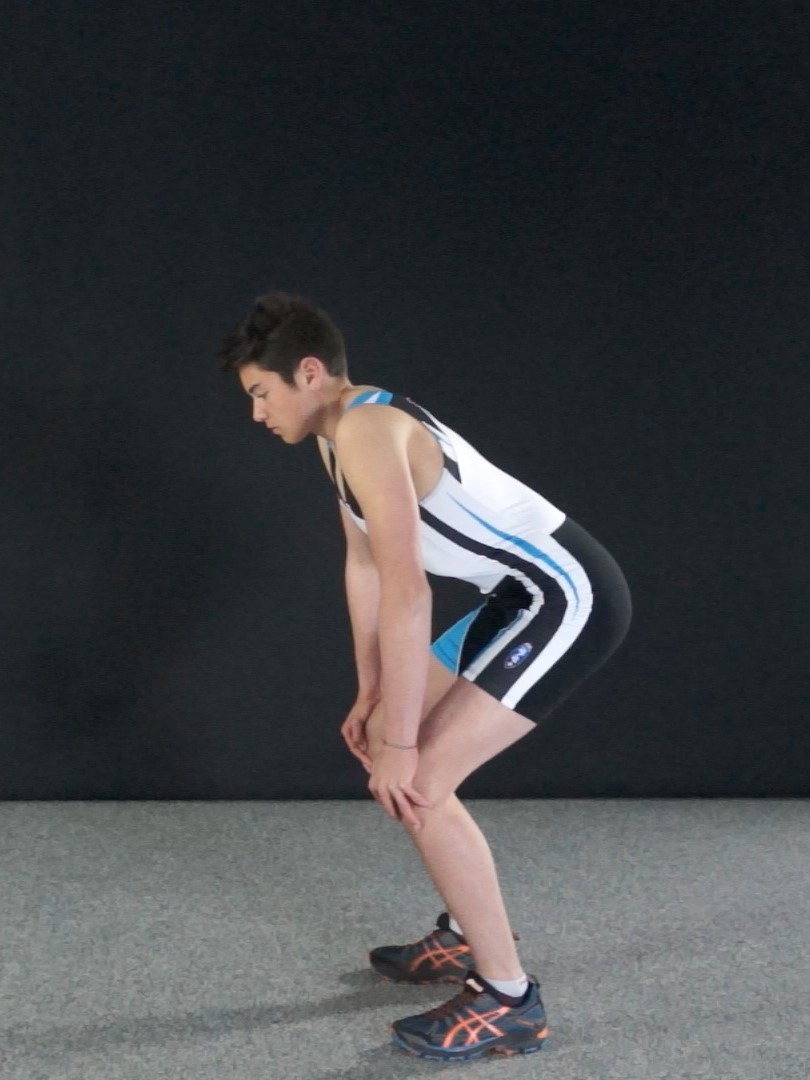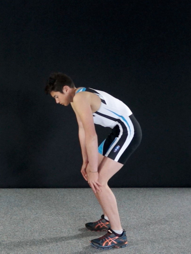 Debout, les jambes semi-fléchies, bras tendus, les mains sur les genoux. Alterner :