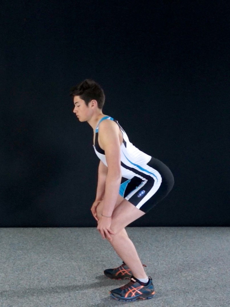 - fléchir les jambes en maintenant la charge à la verticale de la tête en creusant légèrement le dos (l’amplitude de la flexion n’est pas limitée tant que le dos reste placé),