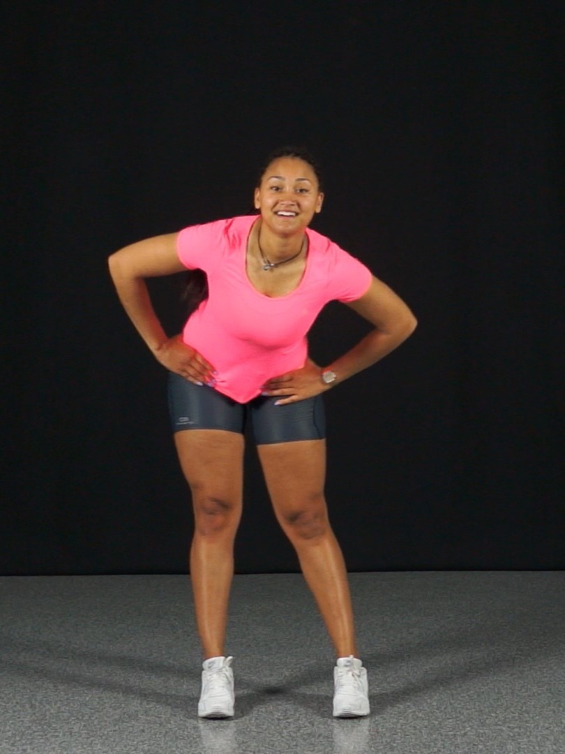 - déplacement sur une dizaine de grands pas en effectuant sur chaque enjambée une flexion (un genou en direction du sol) avec les mains sur les hanches,