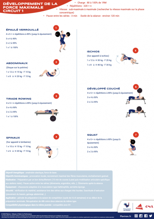 L’athlète enchaine 7 ateliers différents : 4 principaux (épaulé, développé couché, tirade rowing et squat) et 3 complémentaires (abdominaux, spinaux et ischios jambiers).