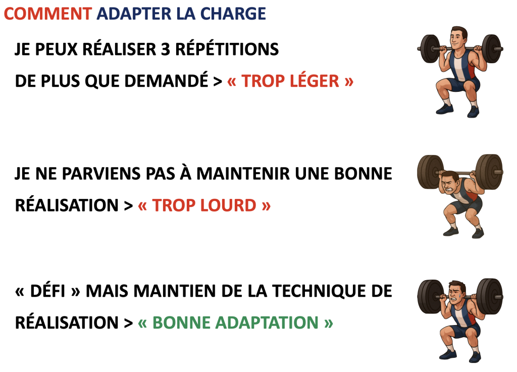 • Méthode de l’effort perçu (RPE) : choisissez une charge permettant 8 à 12 répétitions avec 1 à 2 répétitions en réserve. Exemple : si vous pouvez faire 12 reps, arrêtez-vous à 10.
